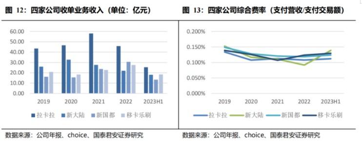對此,國泰君安分析師分析了分析拉卡拉、新大陸、新國都、移卡四家上市公司的支付業務,各家公司的綜合費率在2022年之前大致呈現下降趨勢,2023年上半年,各家公司的支付費率均出現提升,取四家公司平均值,綜合費率從2022年底的0.11%提升至2023H1的0.126%,收單費率呈現觸底回升態勢。
