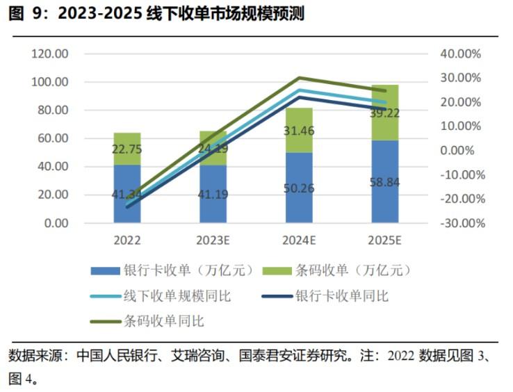 分析師預測,隨著疫情影響逐漸消失,線下消費有望得到持續恢復,一定程度上增加線下收單總交易規模。但2023年支付行業監管趨嚴,對銀行卡收單業務產生了一定影響。因此,他們預計2023年線下收單總額將實現同比微增2%至65.4萬億元,隨著“一機一碼”政策的邊際影響減弱,經濟預期改善以及消費持續恢復,線下收單市場仍會迎來增長機遇,預計2025年線下收單市場規模將達到98萬億元,比2022年增長53%。