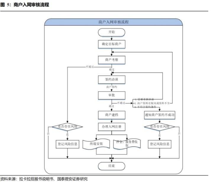 以第三方支付機構拉卡拉為例,拉卡拉主要通過自營模式和通過商戶拓展服務機構的渠道拓展模式進行商戶拓展,然后對商戶進行篩選評估,選定符合條件的商戶與其簽訂收單受理協議,完成簽約的商戶以POS機為入口,通過拉卡拉提供的交易系統開展銀行卡收單業務。特約商戶根據日常交易業務數據和簽約費率,向拉卡拉支付手續費,手續費的支付采用代扣模式,即收單機構先行將手續費扣除后將交易清算資金凈額結算至簽約商戶指定的賬戶中。