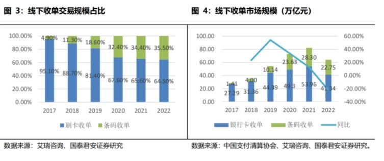 為了方便測算,我們統一選取線上線下合計數據)以及艾瑞咨詢2021年發布的《2021年中國線下收單行業研究報告》和2023年發布的《2023年中國第三方支付行業研究報告》中刷卡收單和條碼收單占比數據測算得出2017-2022年線下收單規模數據。根據我們測算,截至2021年,線下收單市場規模呈上升趨勢,但增長速率放緩;2022年因疫情影響線下收單市場規模同比下降23.39%至64.09萬億元。