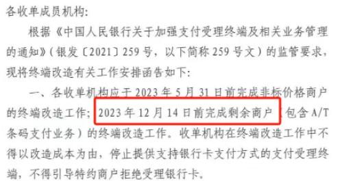 259號文中明確要求在2023年12月14日前完成剩余商戶的終端改造工作。各支付公司估計在12月14日后政策執行完。現在離規定時間越來越近,各支付公司也不會在風口的時候頂風作案,后續只會越來越合規。