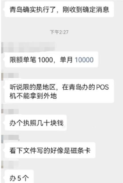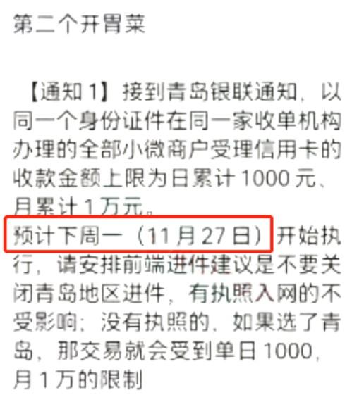 2、有代理商群發(fā)青島銀聯(lián)收到通知要執(zhí)行281號(hào)文,全部小微商戶受理信用卡的收款金額上線為日累計(jì)1000元,月累計(jì)1萬(wàn)元,預(yù)計(jì)11月27號(hào)開(kāi)始執(zhí)行;