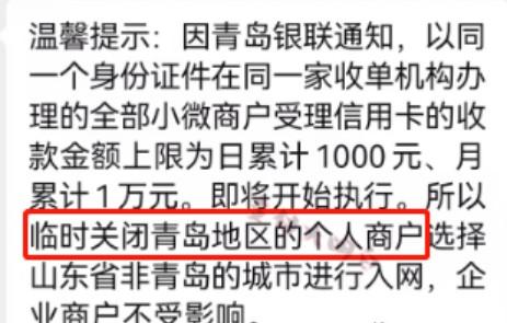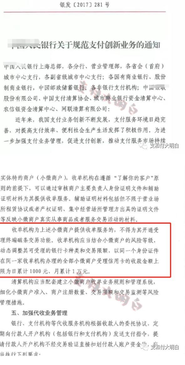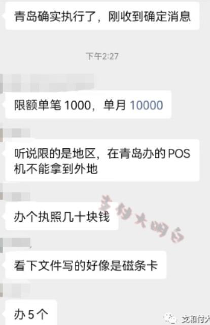 有代理商群發:以同一個身份證件在同一家收單機構辦理的全部小微商戶受理信用卡的金額上限日累計1000元,月累計1萬元,預計11月27開始執行。