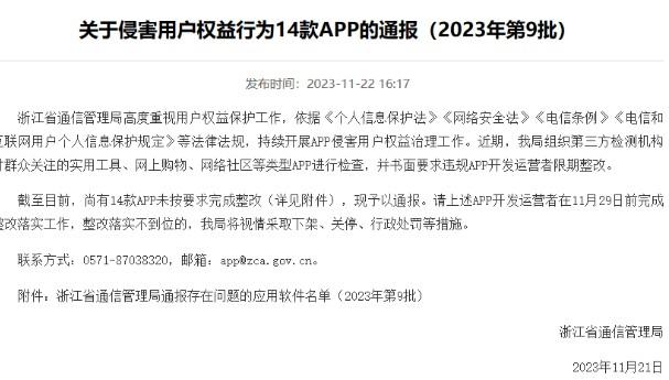 截至目前,尚有14款A(yù)PP未按規(guī)定完成整改,現(xiàn)予以通報。浙江省通信管理局要求相關(guān)APP開發(fā)運(yùn)營者在11月29日前完成整改落實(shí)工作,否則將采取下架、關(guān)停、行政處罰等措施。