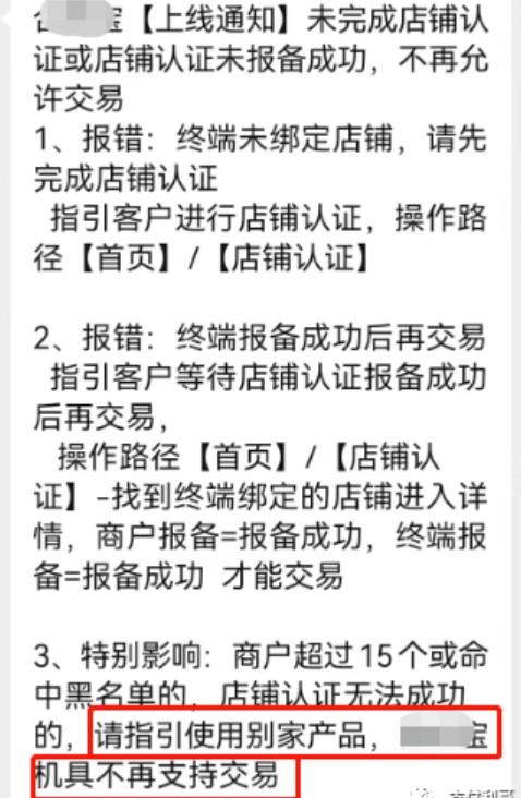 此前某POS機(jī)代理商的通知中就明確提醒:商戶超過15個(gè)或名字黑名單的,請指引使用別家產(chǎn)品,我們的產(chǎn)品不再支持交易。