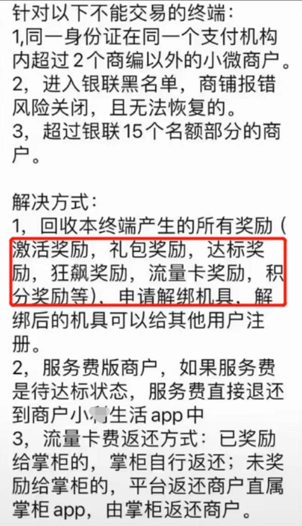 某POS機2.0平臺通知:被清退商戶需扣回激活、達標、流量卡獎勵給平臺