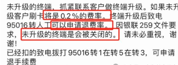 不過還好的是,目前還有補救的機會,已經上調的終端操作升級后可恢復原本的費率;已經被多扣手續費的用戶,可撥打客服電話申請退回。