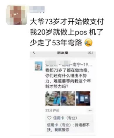73歲大爺單日激活7臺POS機 zhangyu 2年前 ( 2024-02-23 ) 319 近日支付行業(yè)出現了一批大爺,活成了莫欺老年窮的榜樣。73歲的張大爺,發(fā)朋友圈說:我都73歲了,都在做地推,你們還有什么理由不努力,難道要等我這個年齡才努力嗎?今天被這個大爺刷屏了,很多人感慨:大爺73歲才開始做支付,我20歲就做上了POS機了,少走了53年彎路。 The End 標簽:博主很懶,并沒有設置標簽
