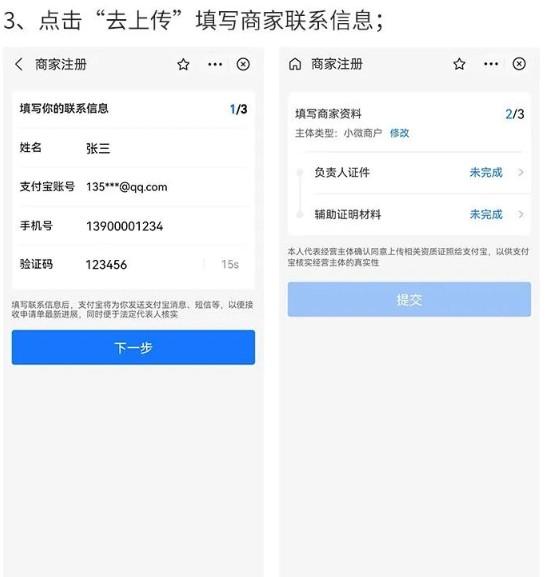 掃碼后點擊注冊新商家-選擇商家主體-填寫商家聯系信息-上傳法人身份證正反面照片及店鋪門頭等照片-提交等待支付寶審核。