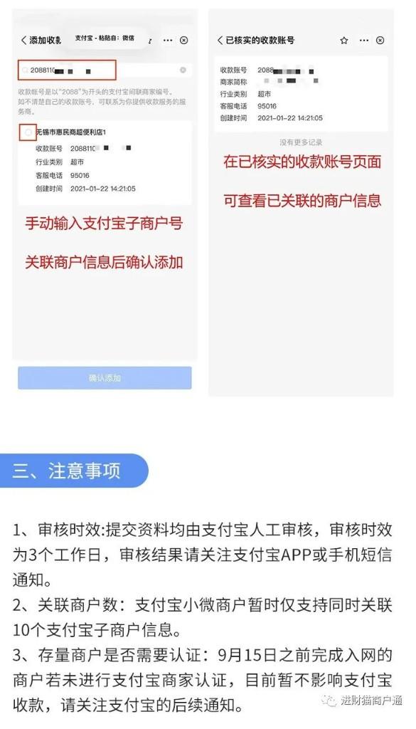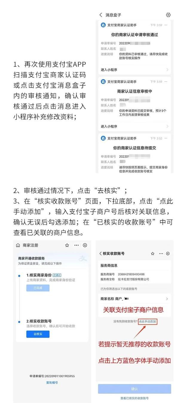 重新掃描支付寶商家認證碼或點擊支付寶消息盒子內的審核通知-根據支付寶的審核結果修改資料-審核通過后核實收款賬號-關聯支付寶子商戶信息-確認添加。