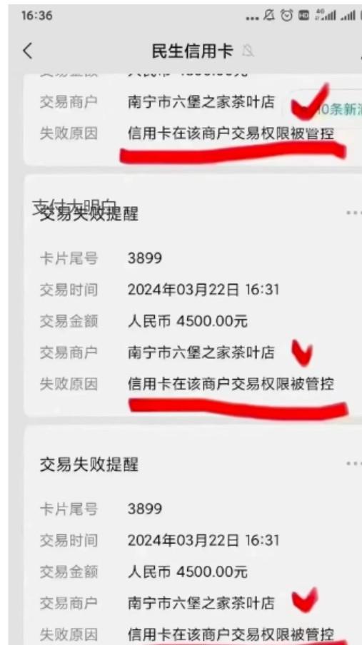 有的銀行就提醒用戶:交易失敗,在該商戶交易權限被管控。