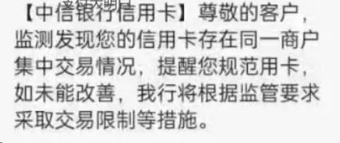 中信銀行提醒:尊敬的客戶,監測發現您的信用卡存在同一商戶集中交易情況,提醒您規范用卡,如未能改善,我行將根據監管要求采取交易限制等措施。