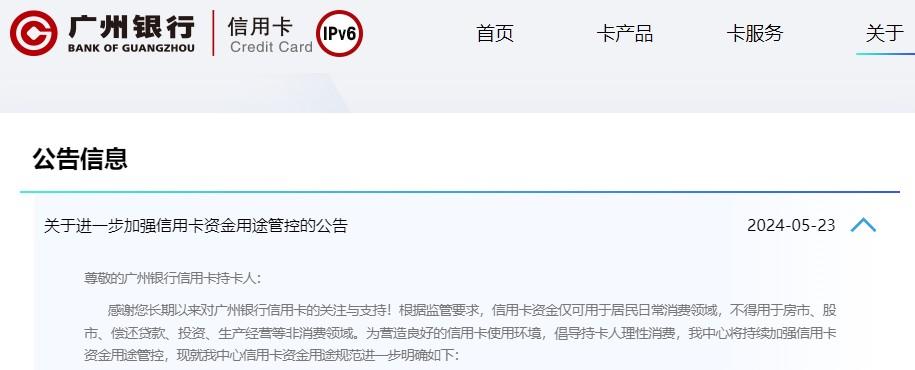 日前,廣州銀行信用卡中心發(fā)布了《關(guān)于進(jìn)一步加強(qiáng)信用卡資金用途管控的公告》。