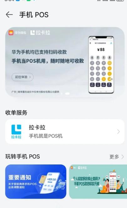 值得指出的是,有報道誤解此通知為華為下線了手機(jī)POS業(yè)務(wù),其實并非如此。目前華為錢包App顯示手機(jī)POS業(yè)務(wù)的收單服務(wù)機(jī)構(gòu)為拉卡拉公司。