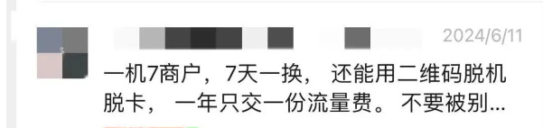 近日,據知情人士爆料,一機七商戶最近火了,朋友圈到處都是,號稱切機神器,1臺機器可以綁定7個商戶輪換使用,一周換一次商戶。