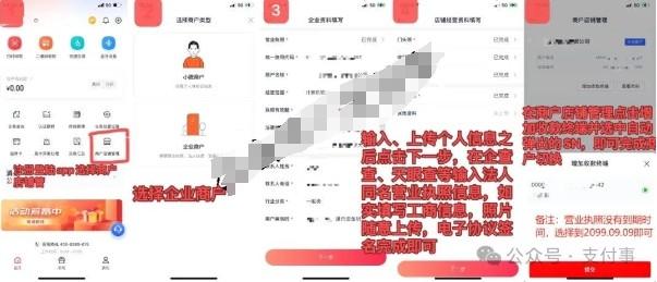 3,添加企業商戶,輸入、上傳個人信息之后點擊下一步,在企查查、天眼查等輸入法人同名營業執照信息,工商信息如實填寫,照片可隨意上傳,行業分類選擇一般類,商戶類別碼根據需要選擇之后點擊下一步,照片隨意上傳并簽訂電子協議即可完成新增商戶
