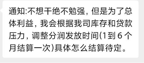 有代理商收到上級通知:不想干絕不勉強,但是為了總體利益,我會根據我司庫存和貸款壓力,調整分潤發放時間(1-6個月結算一次)具體怎么結算待定。