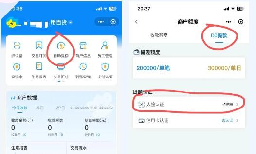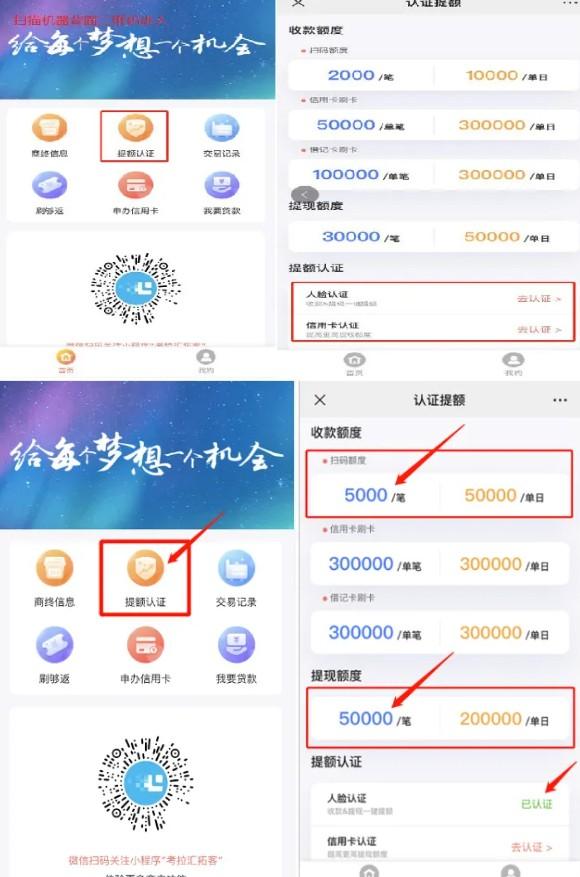(1)支付寶掃一掃,掃描機器背后二維碼,輸入身份證后6位,選擇提額認證—人臉認證即可,(做完人臉認證,單筆秒到5萬,一天秒到20萬,如果不夠,可以再認證一張本人信用卡,每天秒到額度上漲到30萬),營業執照用戶可不用。