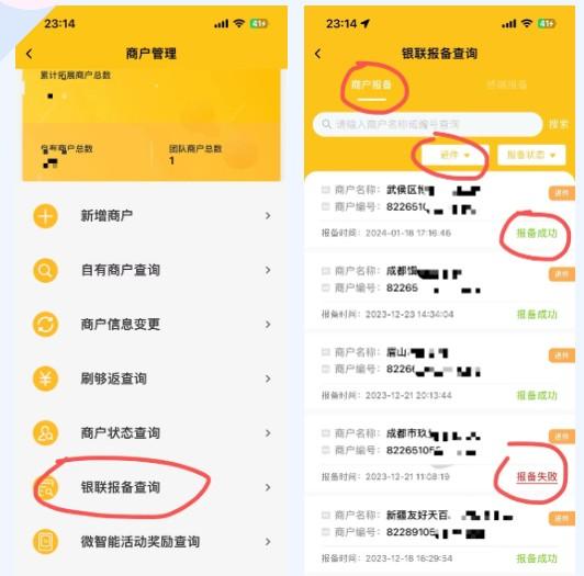 好拓客APP—我的業(yè)務(wù)—商戶(hù)管理—銀聯(lián)報(bào)備查詢(xún)(商戶(hù)報(bào)備—進(jìn)件)