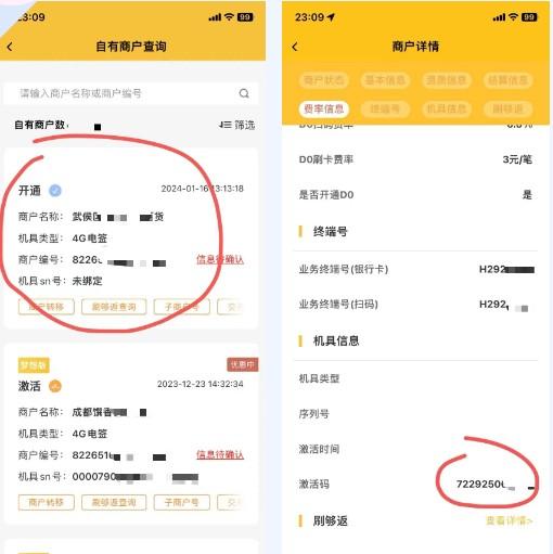 提交資料后,一般會(huì)自動(dòng)返回到商戶(hù)詳情頁(yè)面,【商戶(hù)管理】—【自有商戶(hù)查詢(xún)】,商戶(hù)顯示“開(kāi)通”,即審核通過(guò)。點(diǎn)一下商戶(hù)信息,就會(huì)進(jìn)入商戶(hù)詳情頁(yè)面,再下滑到最底部,即可看到商戶(hù)激活碼。