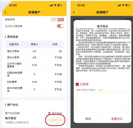 第三步:確認(rèn)費(fèi)率(無(wú)法修改),同意并簽署商戶(hù)電子協(xié)議提交審核,簽名盡量正楷,提交后等待審核通過(guò),一般都是秒審核。