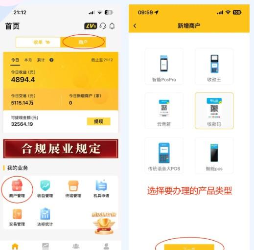 2、收款碼、云音箱、智能POS機(jī)、智能POSPro等真實(shí)商戶(hù)產(chǎn)品入網(wǎng),首頁(yè)最上面需選擇【商戶(hù)】選項(xiàng),APP中間直【我的業(yè)務(wù)】一欄,接選擇【商戶(hù)管理】—【新增商戶(hù)】——選擇相應(yīng)的產(chǎn)品類(lèi)型,進(jìn)行資料填寫(xiě)。