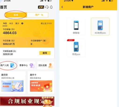 1、電簽、微智能、出票大POS機(jī)入網(wǎng),首頁(yè)最上面默認(rèn)為【收單】選項(xiàng),APP中間直接選擇【商戶(hù)入網(wǎng)】,或者選擇【商戶(hù)管理】—【新增商戶(hù)】——選擇相應(yīng)的產(chǎn)品類(lèi)型,進(jìn)行資料填寫(xiě)。