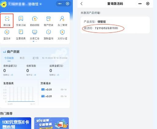 商戶在申請材料提交后進入審核階段,會直接進入下一步,輸入身份證后六位,進入查詢界面。如果已經關閉鏈接,用微信或者支付寶掃開通的二維碼再次進入即可。若審核失敗,請按照注冊頁面提示進行修改或咨詢辦理人員核實。注意:第一次登陸需要驗證手機號,授權手機號進行登陸“拉卡拉”小程序,頁面頂部出現開通的商戶名字后,即可正常使用;點擊綁設備—查詢激活碼