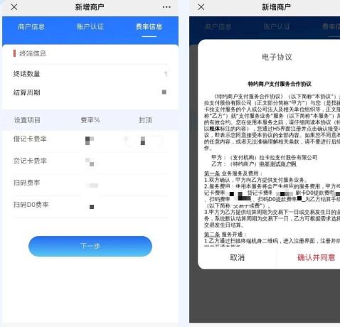 第三步:確認費率(無法修改),同意并簽署商戶電子協議提交審核,簽名盡量正楷,提交后等待審核通過,一般都是秒審核。