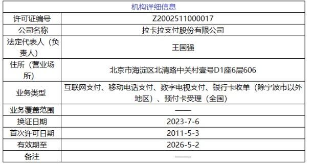 拉卡拉成立于2005年,于2011年獲得《支付業務許可證》,目前擁有全國性的互聯網支付、移動電話支付、數字電話支付、預付卡受理業務及除寧波市以外的全國性銀行卡收單業務資質,是國內領先的第三方支付公司,公司定位為“商戶數字化經營服務商”。2011年首批獲得中國人民銀行頒發的《支付業務許可證》。2019年4月25日,拉卡拉支付在深交所成功上市,成為第一家登陸A股市場的第三方支付企業,股票代碼300773。