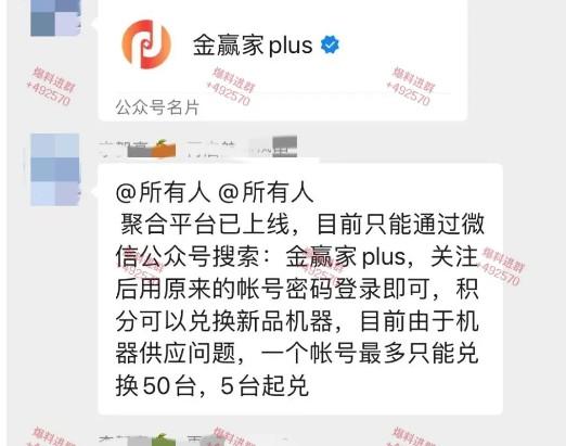 金贏客代理管理群內通知聚合平臺已上線,目前只能通過微信公眾號搜索金贏家Plus。關注后用原來的賬號密碼登錄即可。據了解,北京金贏客注冊于2021年6月,這與現在的金贏家Plus是一家公司。