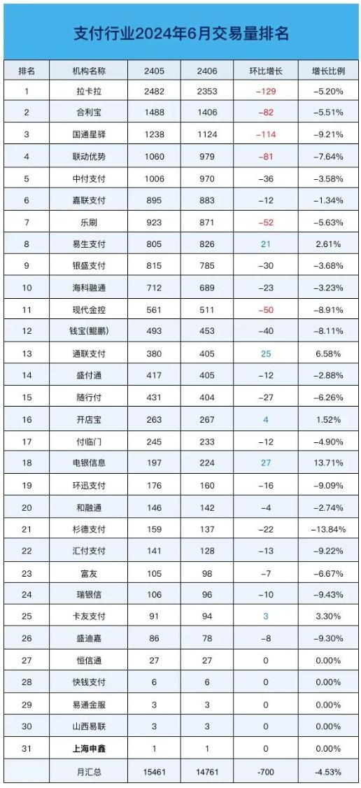 6月份所有上榜的31家支付公司的總交易量約為14,761億元人民幣,與5月份相比減少了約700億元,下降比例為4.53%。考慮到6月比5月少一天,實(shí)際交易量下滑幅度約為1.2%,即180億元,下滑速度較之前有所放緩。