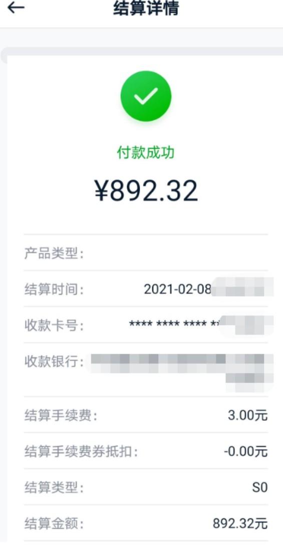 而刷卡892.32元的交易截圖:扣取了一個(gè)手續(xù)費(fèi)3元。不是按0.6%費(fèi)率計(jì)算的,也沒(méi)有扣除1000元以下的費(fèi)率。