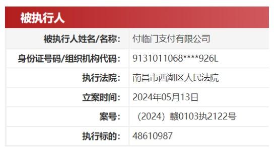 日前,據中國執行信息公開網信息顯示,持牌支付機構付臨門支付有限公司新增了一條被執行人信息,此次執行標的超過1個億,執行案號為(2024)贛01執564號,立案時間為2024年08月13日。