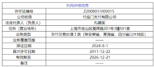 在近日,付臨門支付已經完成支付牌照換證,業務類型為支付交易處理Ⅰ類(除安徽省、青海省、四川省以外地區)。