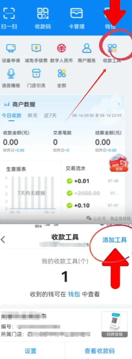 2、綁定商戶后,我們在拉卡拉APP首頁-收款工具-添加工具-掃碼綁定碼牌云音箱。(備注:云音箱自帶4G網,開機即可聯網使用)