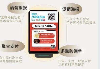 支持語音營銷:客顯屏音箱不僅是一個收款工具,還能夠進行語音營銷和海報投放。通過生動的語音播報和視覺效果,幫助門店有效促進交易量,提高顧客的購物體驗。