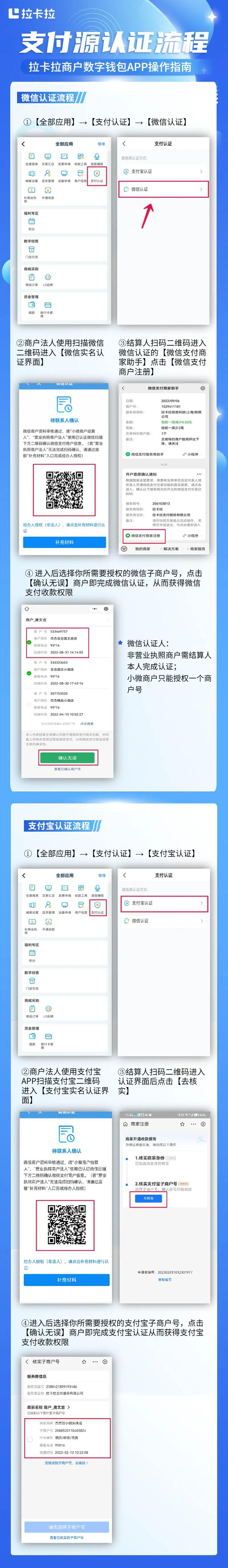 1.手機應用商店下載《拉卡拉商戶數字錢包》2.用開通時提供的手機號和證件登陸實名3.微信和支付寶認證(簡單,下方有圖示)收款-選擇下方保存二維碼至相冊記得每次收款更新生成新的二維碼