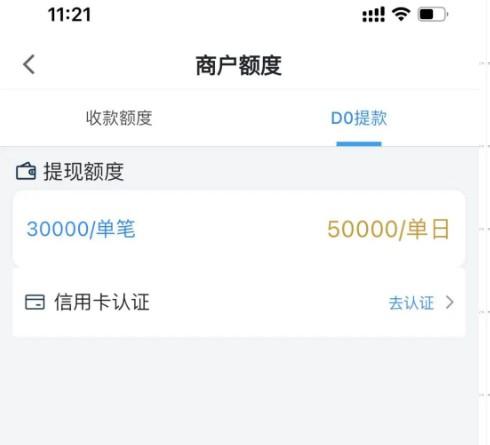 第三步:首頁進(jìn)入商戶信息,商戶額度選擇D0提額,認(rèn)證信用卡或者人臉識別提升秒到額度