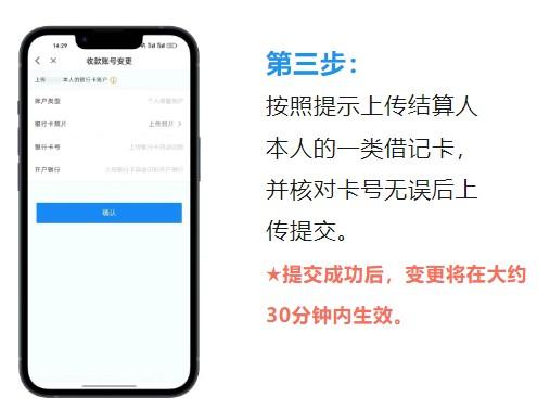 按照提示上傳結(jié)算人本人的一類借記卡,并核對(duì)卡號(hào)無(wú)誤后上傳提交。★提交成功后,變更將在大約30分鐘內(nèi)生效。