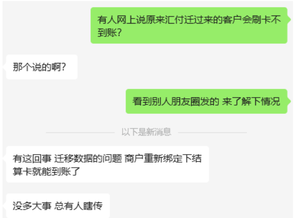 不過,近日有代理商曝出原匯付天下POS機的使用客戶,在轉移到新平臺后,可能會出現刷卡不到賬的情況。