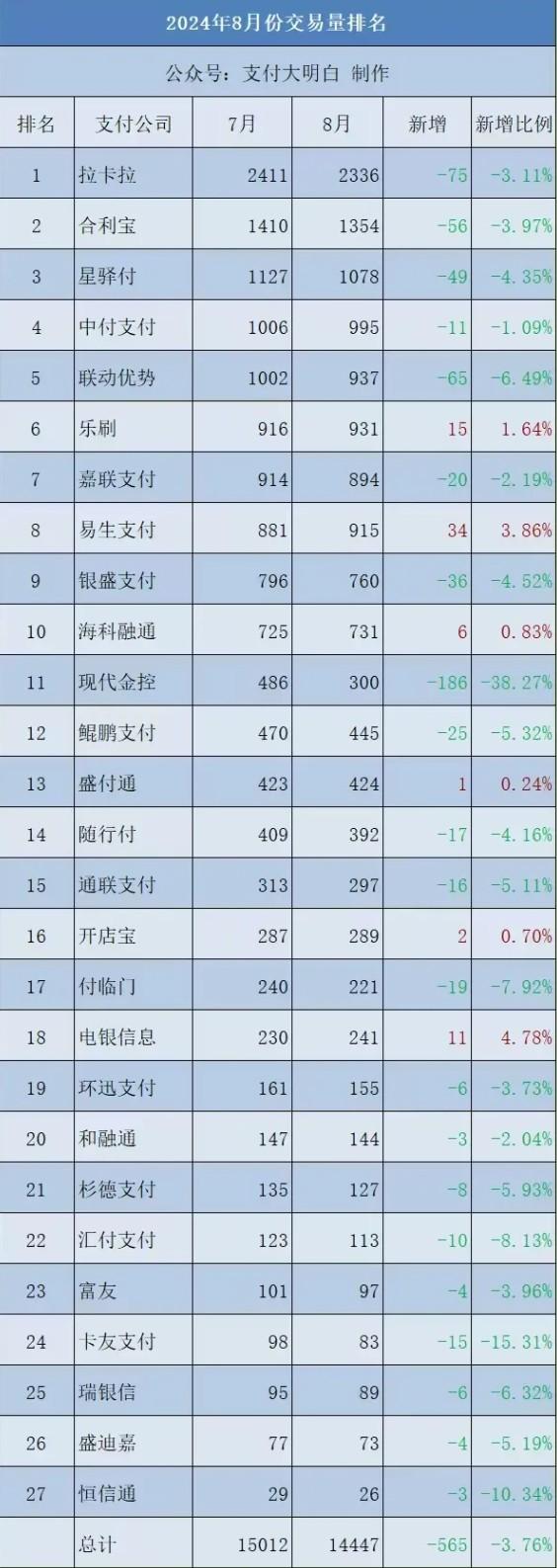 最近,10月份各支付公司交易量排名公布,跟9月份相比,穩中有升,10月份有6家支付公司交易量過1000億,分別是:拉卡拉、合利寶、國通、中付、易生、樂刷,比9月份多了2家。