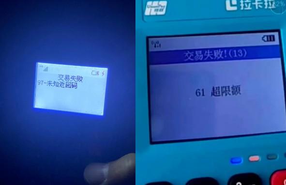 最近有很多拉卡拉用戶反映說自己的pos設(shè)備使用的時候提示提示61-超限額,如下圖具體是怎么回事呢?