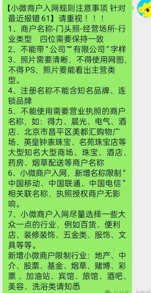 報錯61也很多用戶是注冊的商戶類型不符合拉卡拉最新入網(wǎng)要求被限額,有的用戶只能刷500內(nèi),比如注冊了禁止入網(wǎng)煙酒類的商戶!如下圖,小微商戶入網(wǎng)盡應(yīng)該選擇,百貨,便利店,服裝,餐飲,五金建材,大眾一些的類型等等,限制行業(yè)不要選擇。