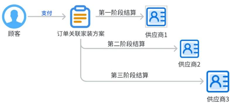 家裝行業(yè)涉及設(shè)計(jì)、建材、施工等多個環(huán)節(jié),各服務(wù)提供商眾多,收款方式和賬期也各不相同,整體結(jié)算周期較長,常規(guī)的訂單分賬已無法滿足業(yè)務(wù)需求,開放平臺提供定制化轉(zhuǎn)賬服務(wù)。顧客付款成功后,支付訂單關(guān)聯(lián)家裝方案,家裝平臺可以根據(jù)施工完成情況筆筆結(jié)算給供應(yīng)商。