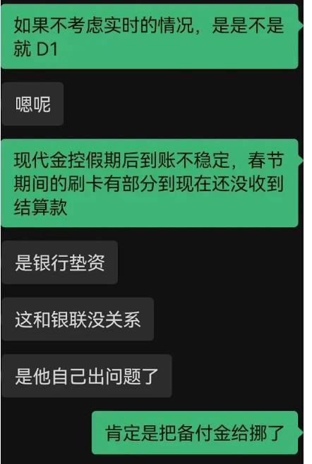 春節(jié)假期雖然長,但是基本第三方支付公司的機(jī)器都能實(shí)現(xiàn)秒到賬,而現(xiàn)代金控不但不能秒到賬,而且現(xiàn)在假期已過,還依然出現(xiàn)到賬延遲問題,因此,大膽猜測(cè)就是“資金”被支付公司挪用,同時(shí)大家也可以再評(píng)論區(qū)討論討論還有沒有其他可能性?