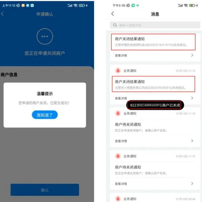 確認無誤后點擊下方的確認按鈕提交,消息通知頁面可查詢商戶關閉結果,如已操作成功,會顯示商戶關閉成功。