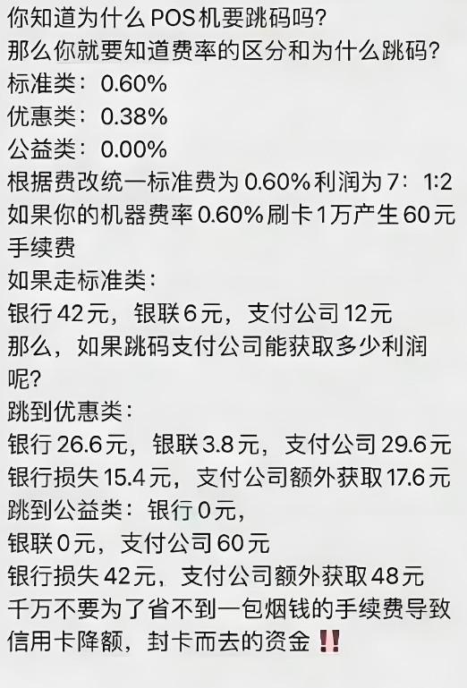 避坑提示警惕“0.55%以下超低費率”宣傳,可能通過跳碼(公益類商戶)降低成本,導致信用卡降額風險!