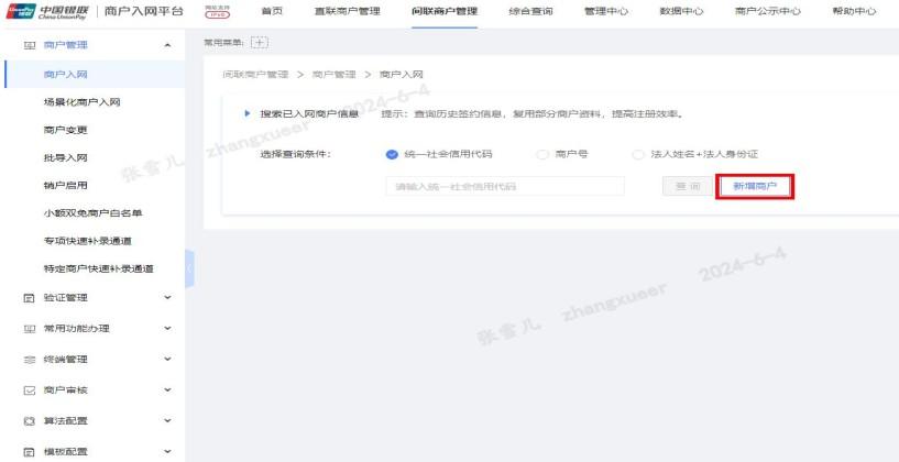 點(diǎn)擊“間聯(lián)商戶管理”-“商戶管理”-“商戶入網(wǎng)”進(jìn)入商戶錄入頁面;點(diǎn)擊“新增商戶”,開始錄入一個(gè)全新的商戶。