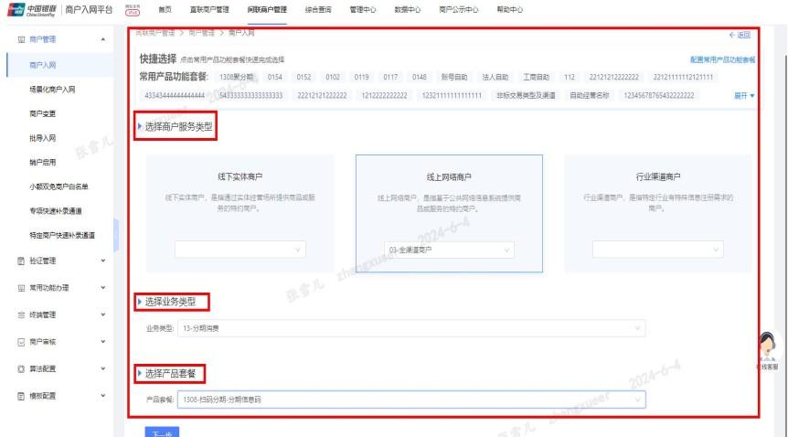 選擇“新增商戶”后,出現(xiàn)一個(gè)頁面,此處選擇“線上網(wǎng)絡(luò)商戶”,并對(duì)商戶服務(wù)類型、業(yè)務(wù)類型、產(chǎn)品功能套餐選擇如下相應(yīng)取值: